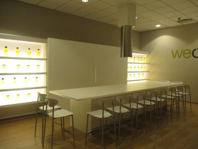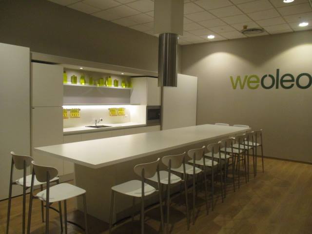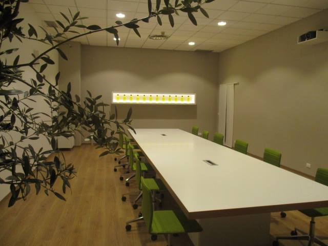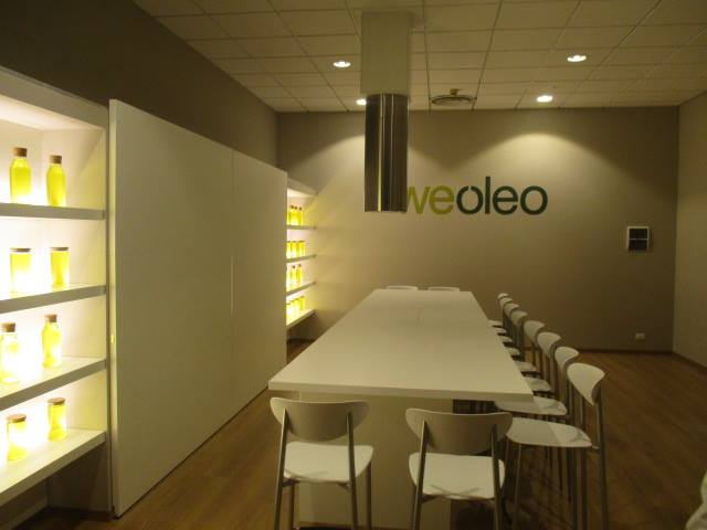 Un’ampia zona living contemporanea appare sospesa tra il bianco, la trasparenza dell’illuminazione e il tocco di verde che richiama la naturalezza dell’olio d’oliva.